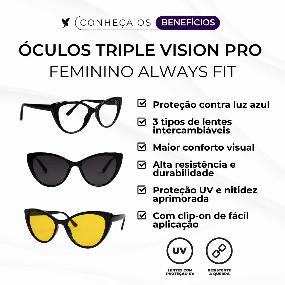 Óculos Triple Vision Pro - Bloqueador de Luz Azul com Lentes Amarela, Polarizada e Transparente Feminino