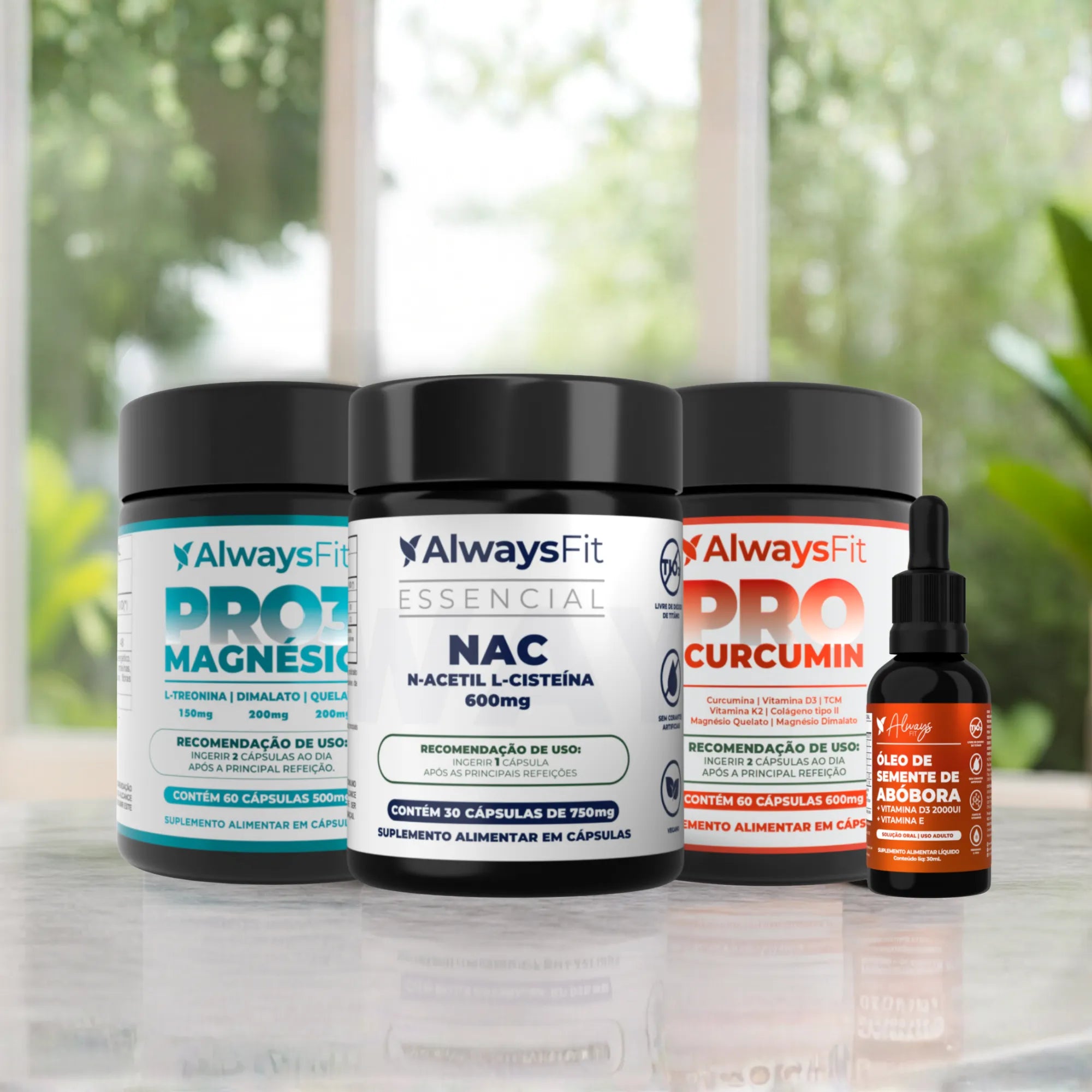 O Kit Saúde Total Always Fit, reúne quatro suplementos que atuam em sinergia para oferecer suporte completo à energia, imunidade e equilíbrio metabólico.