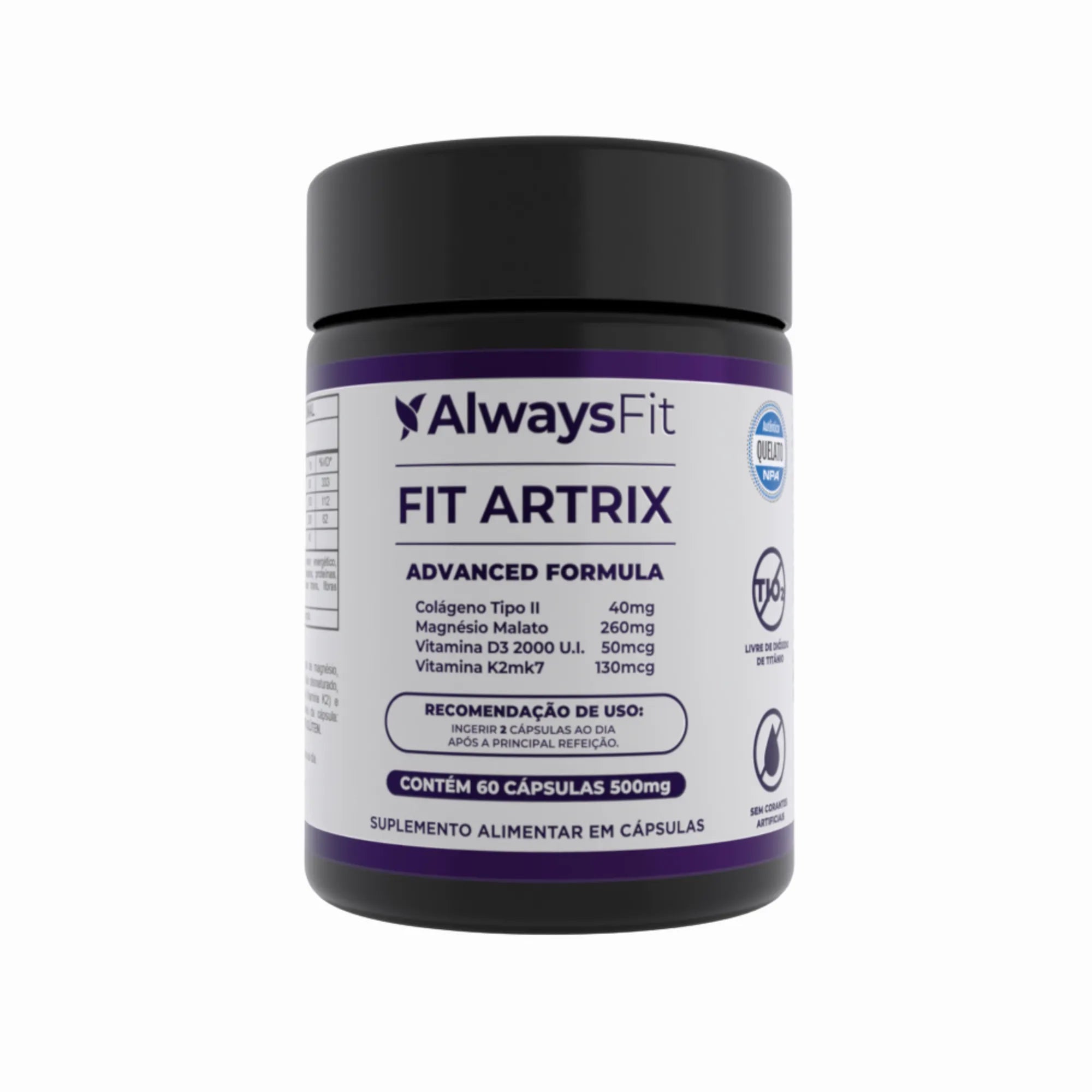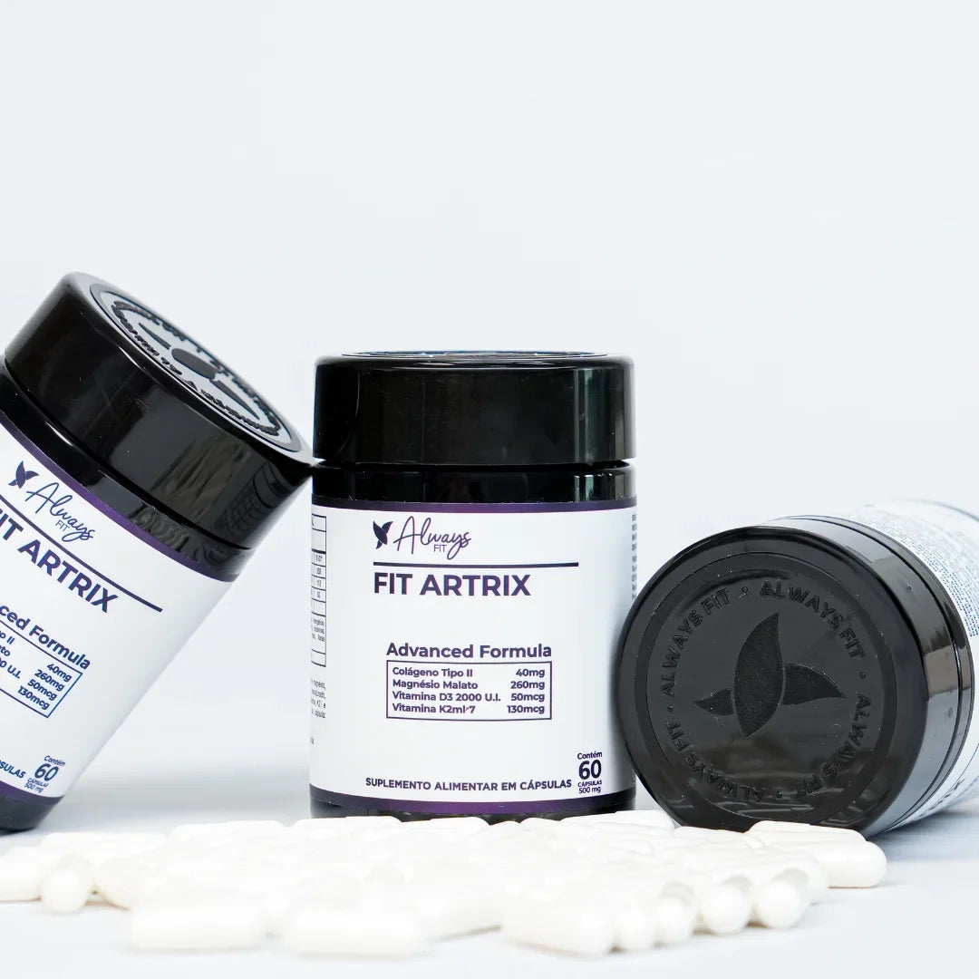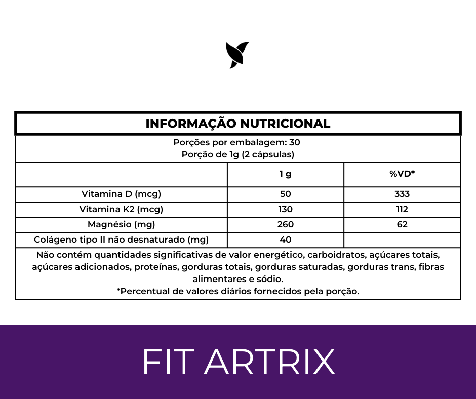 FitArtrix é um suplemento alimentar em cápsulas formulado com nutrientes selecionados para complementar sua rotina com compostos que participam de processos relacionados à saúde óssea e articular. Sua fórmula combina colágeno tipo II não desnaturado, magnésio dimalato, vitamina D3 e vitamina K2 MK7, em uma apresentação prática para uso diário.
