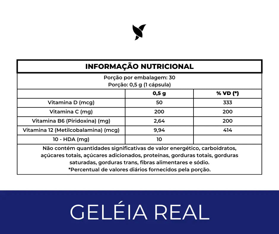 Geleia real liofilizada, ácido ascórbico (Vit. C), cloridrato de piridoxina (Vit. B6), colecalciferol (Vit. D3), metilcobalamina (Vit. B12) e antiumectante dióxido de silício.