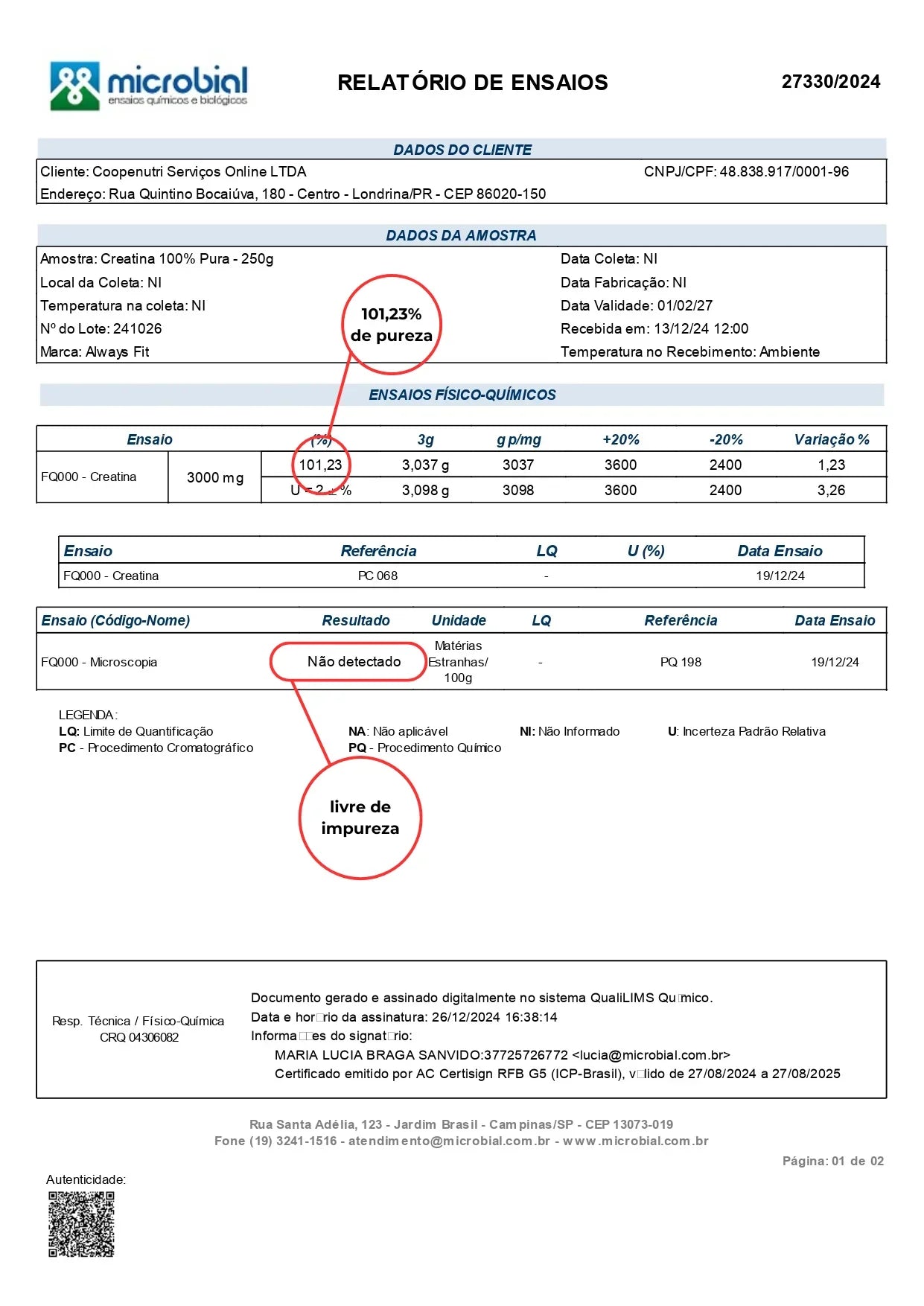 Laudo de pureza: Clique aqui para baixar