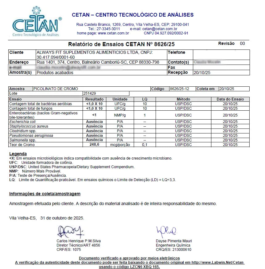 • Forma altamente biodisponível (picolinato), com excelente absorção